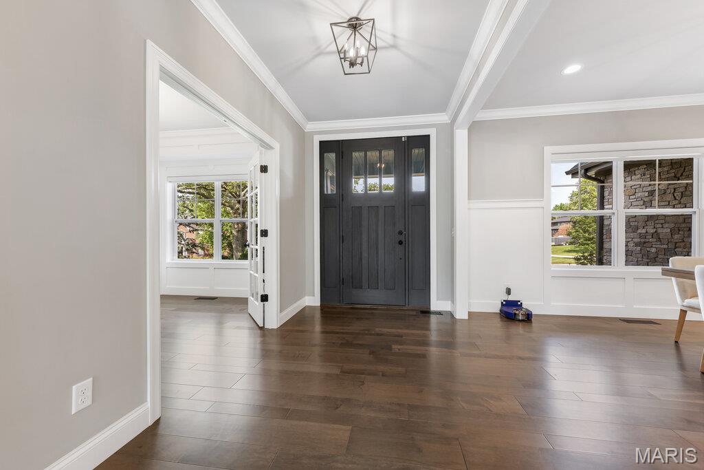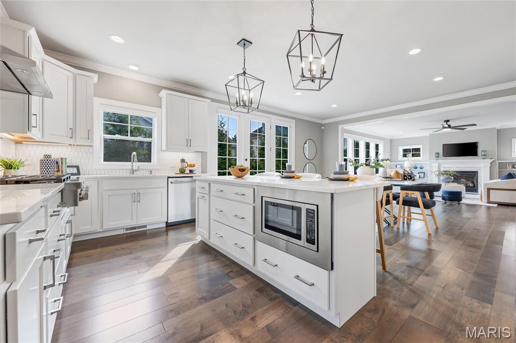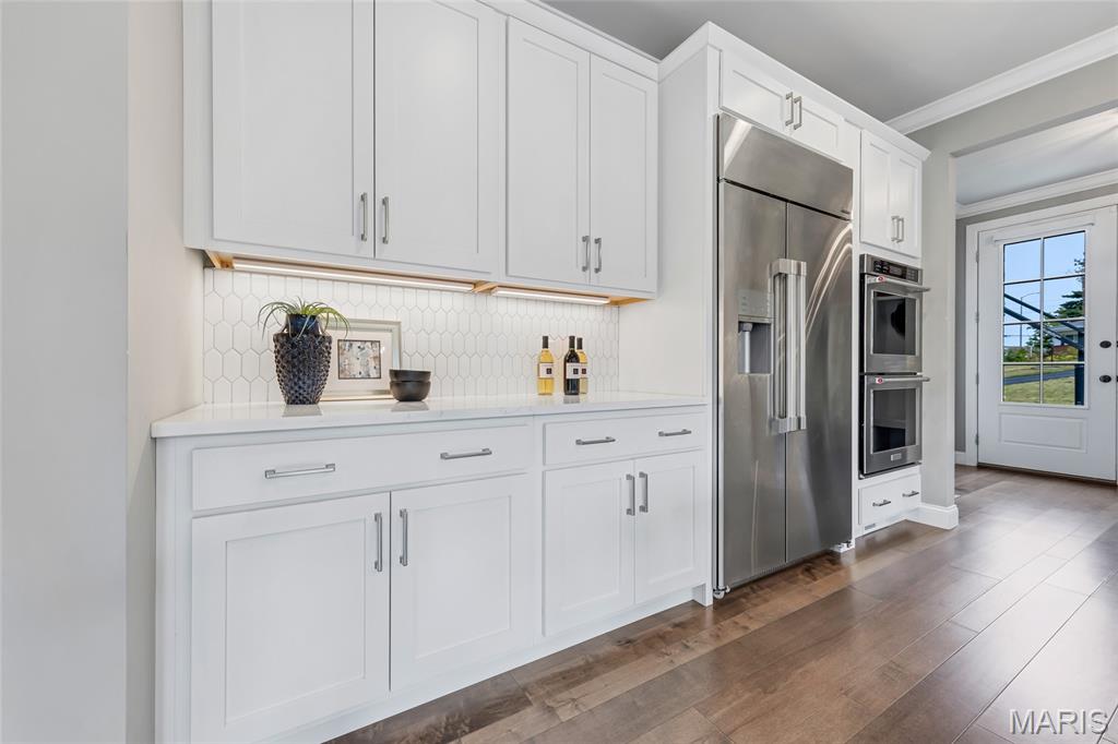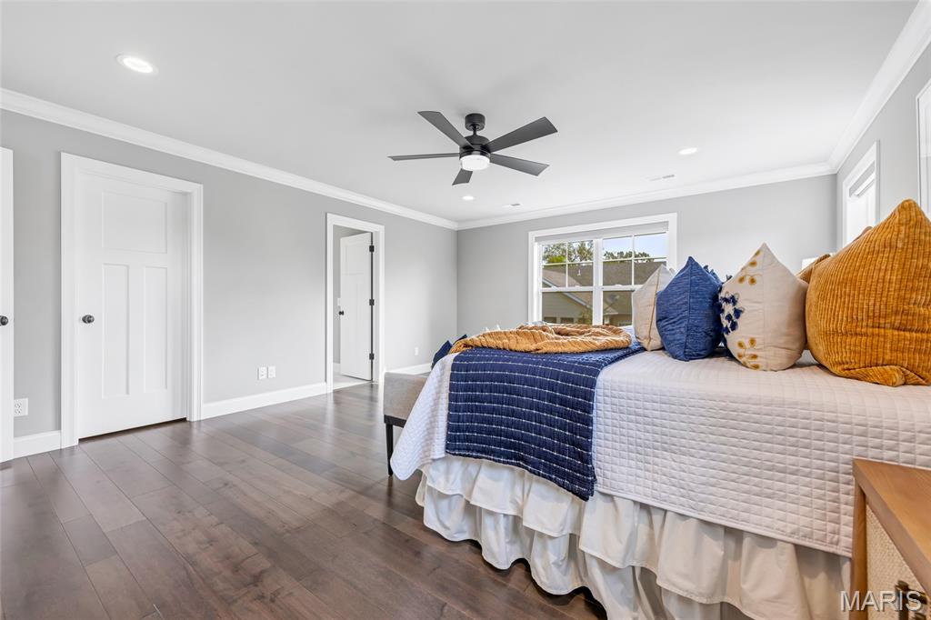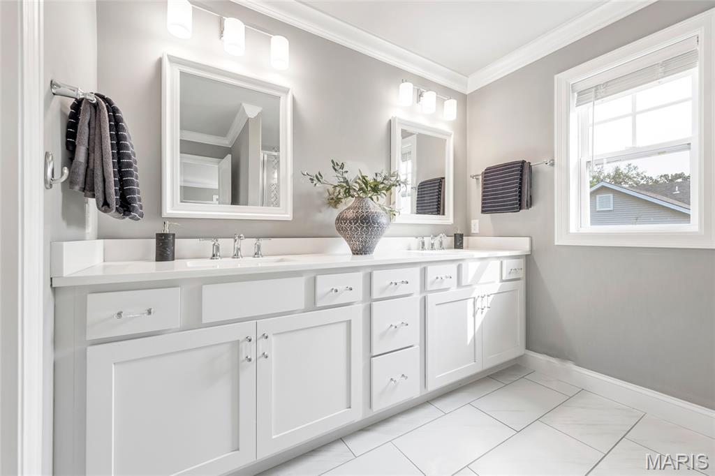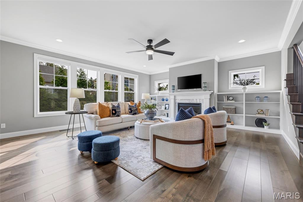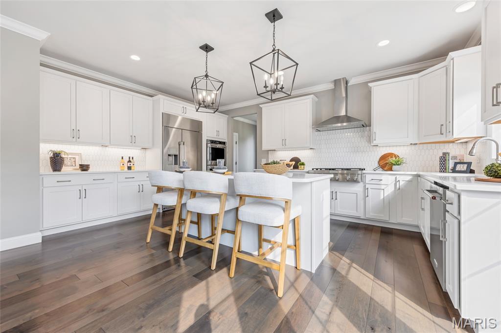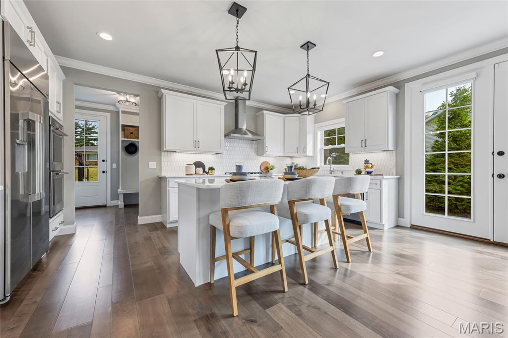 Beautiful newer home in Ladue School District! Just 3 years old, this modern, open floor plan has tons of natural light! The great room opens to a custom kitchen with large center island and top-of-the-line appliances, quartz countertops, 42" cabinets and beautiful wood floors throughout. There is also a main floor laundry with 42 inch cabinets and a mud room. Off of the entry foyer is a cozy den/office with wainscoting & crown molding. The primary bedroom on 2nd floor features crown molding, spa-like bath with double sink vanity and custom shower. The additional 3 bedrooms on the 2nd floor are all ensuite. Large finished lower level with huge recreational room plus an additional bedroom and full bath. This is a great opportunity to live in newer construction in Ladue School District!