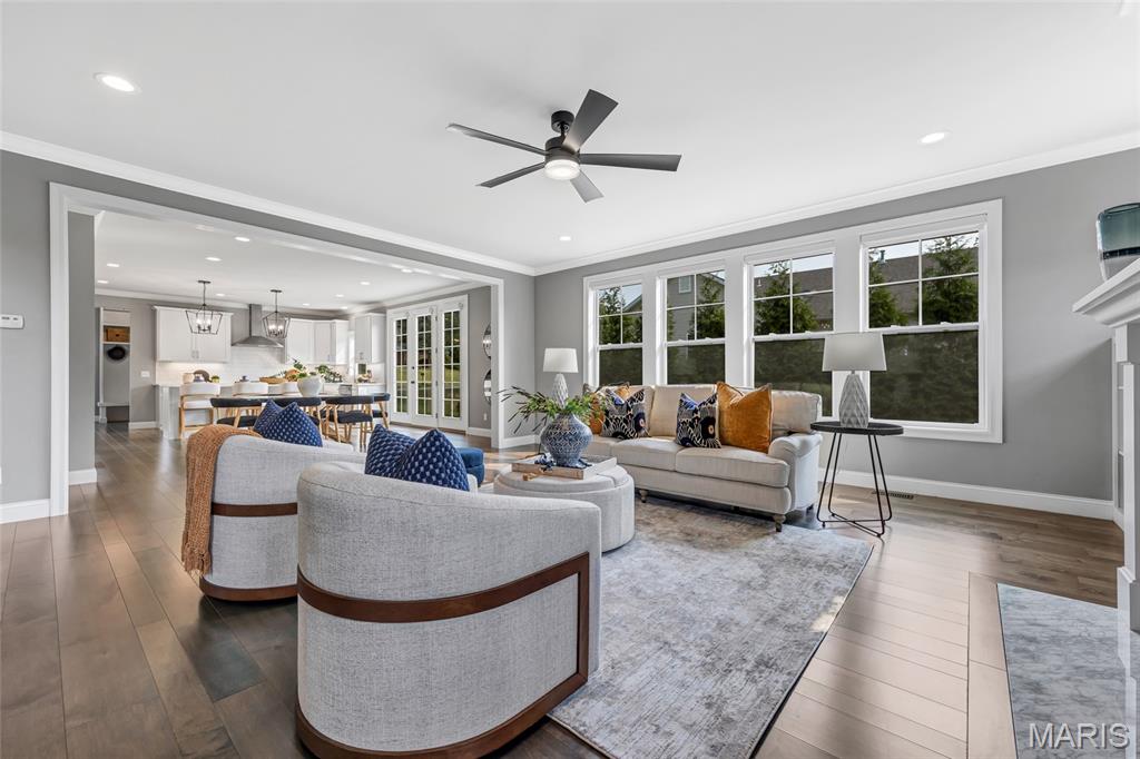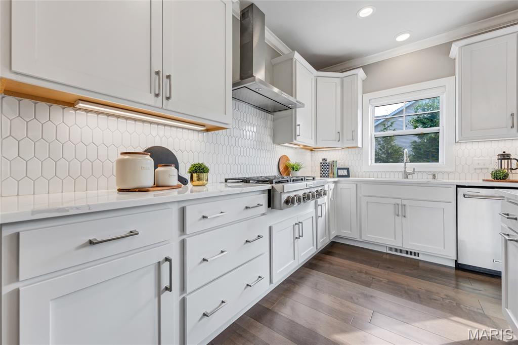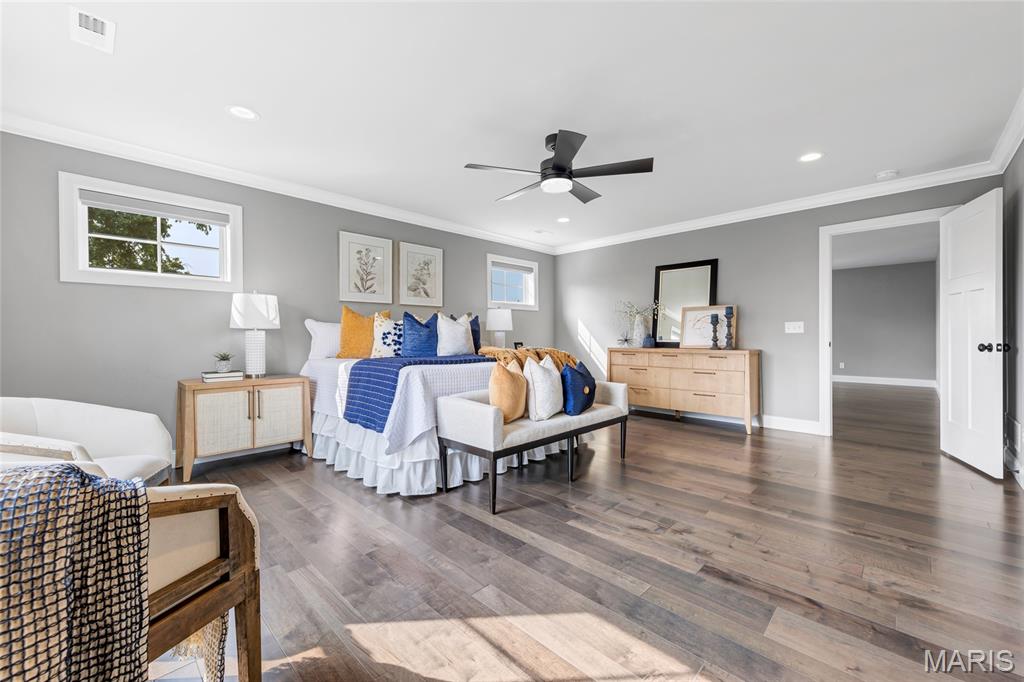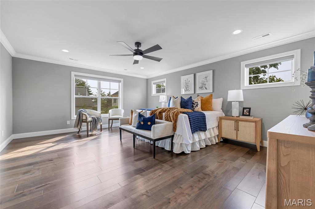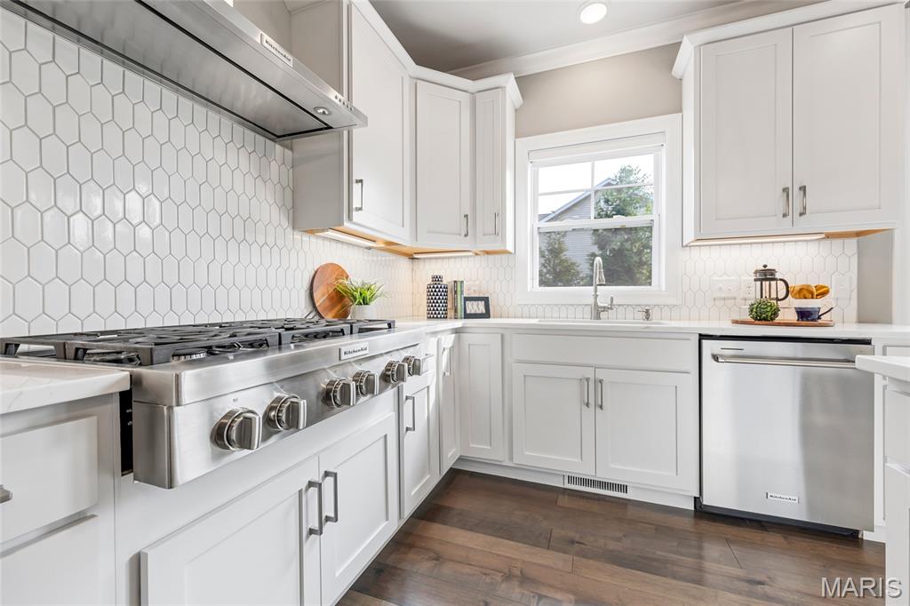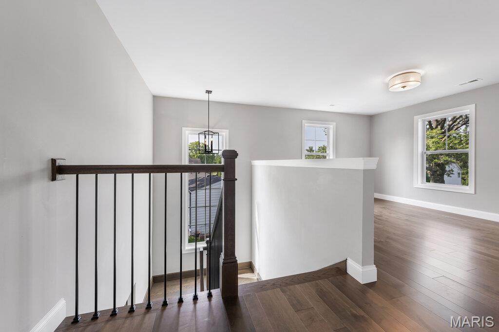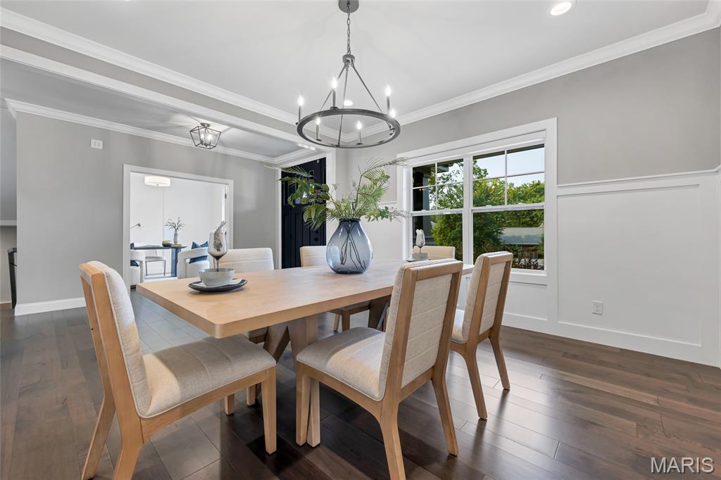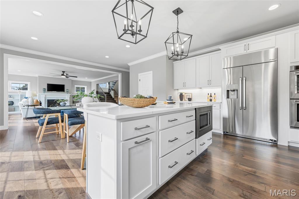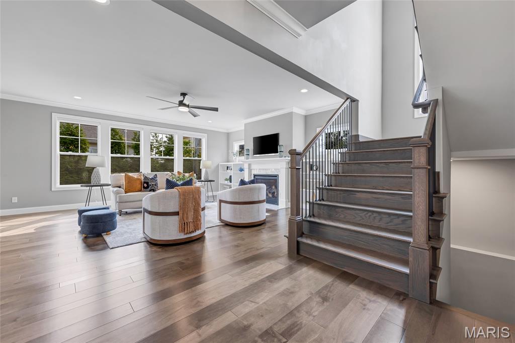 Beautiful newer home in Ladue School District! Just 3 years old, this modern, open floor plan has tons of natural light! The great room opens to a custom kitchen with large center island and top-of-the-line appliances, quartz countertops, 42" cabinets and beautiful wood floors throughout. There is also a main floor laundry with 42 inch cabinets and a mud room. Off of the entry foyer is a cozy den/office with wainscoting & crown molding. The primary bedroom on 2nd floor features crown molding, spa-like bath with double sink vanity and custom shower. The additional 3 bedrooms on the 2nd floor are all ensuite. Large finished lower level with huge recreational room plus an additional bedroom and full bath. This is a great opportunity to live in newer construction in Ladue School District!