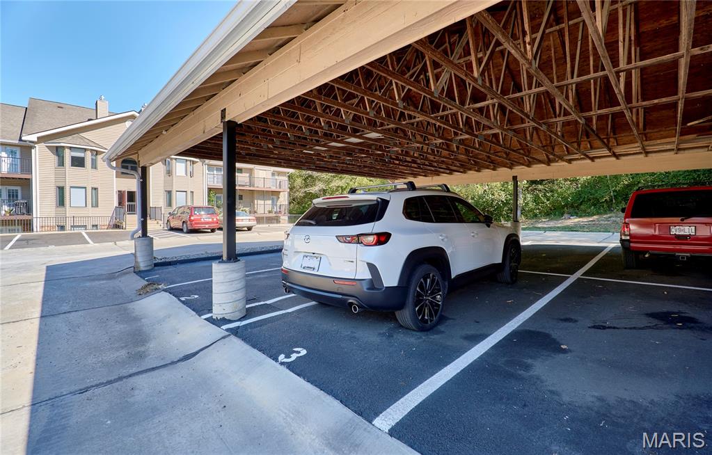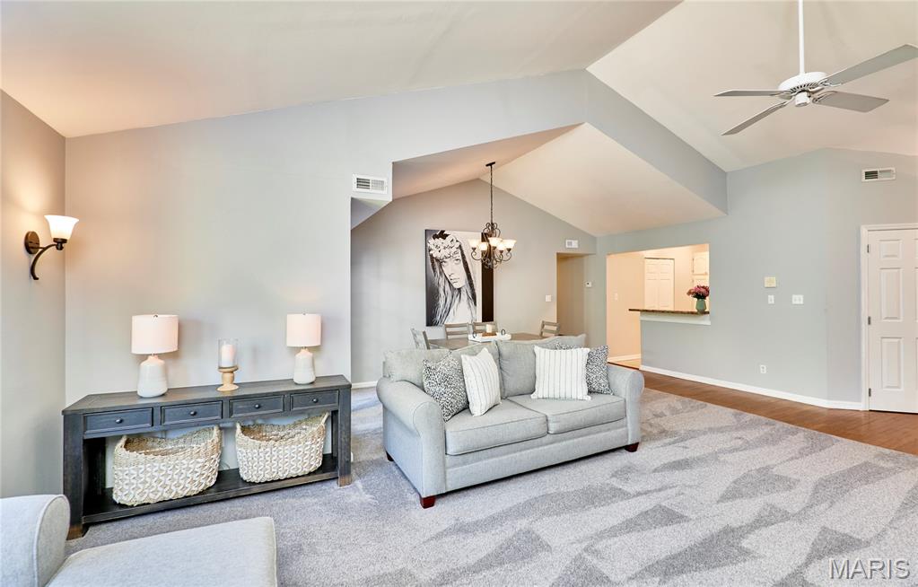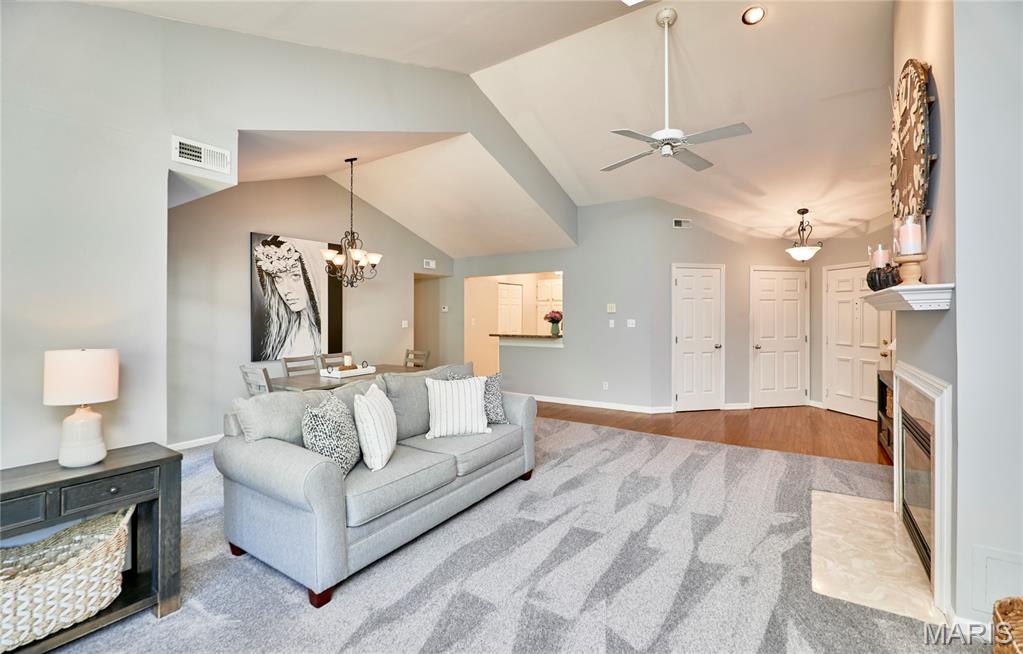 Beautifully maintained 2-bedroom, 2-bath upper-level condo offering space, comfort, and low-maintenance living in a convenient South County location. This light-filled unit features an open and airy floor plan with vaulted ceilings, creating a welcoming atmosphere throughout the main living area. The spacious living room is highlighted by a wood-burning fireplace and opens to a private deck with peaceful wooded views, perfect for relaxing or entertaining. The kitchen provides ample cabinetry, generous counter space, and flows seamlessly into the dining area. The primary suite is generously sized with excellent closet space and an en-suite bath. A second bedroom and full bath offer flexibility for guests, a home office, or additional living space. In-unit laundry adds everyday convenience. Enjoy secure entry with intercom, assigned covered parking, and access to community amenities including an in-ground pool. The HOA covers water, sewer, trash, lawn care, snow removal, and exterior maintenance—making for truly carefree condo living. Recent updates include deck, HVAC, and water heater, offering peace of mind for the next owner. Conveniently located near shopping, dining, parks, and major highways. Move-in ready and a great opportunity!